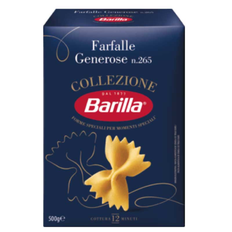Barilla FARFALLE are a creative and beautiful shape inspired by butterflies, loved by kids and adults alike. The butterfly shape gives Farfalle a unique texture, both smoot and toothsome at the same time. Try Farfalle with light vegetable sauces or in pasta salads and enjoy an authentic Italian meal.